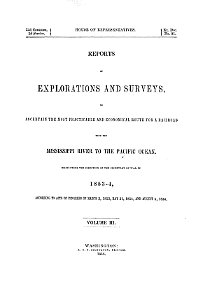 Amiel Weeks Whipple: Reports of Explorations and Surveys, to Ascertain the Most Practicable and Economical Route for a Railroad from the Mississippi River to the Pacific Ocean. Made under the Direction of the Secretary of War, in 1853-4, According to Acts of Congress of March 3, 1853, Mai 31, 1854, and August 5, 1854. Volume III.- Washington: A. O. P. Nicholson, Printer. 1856.